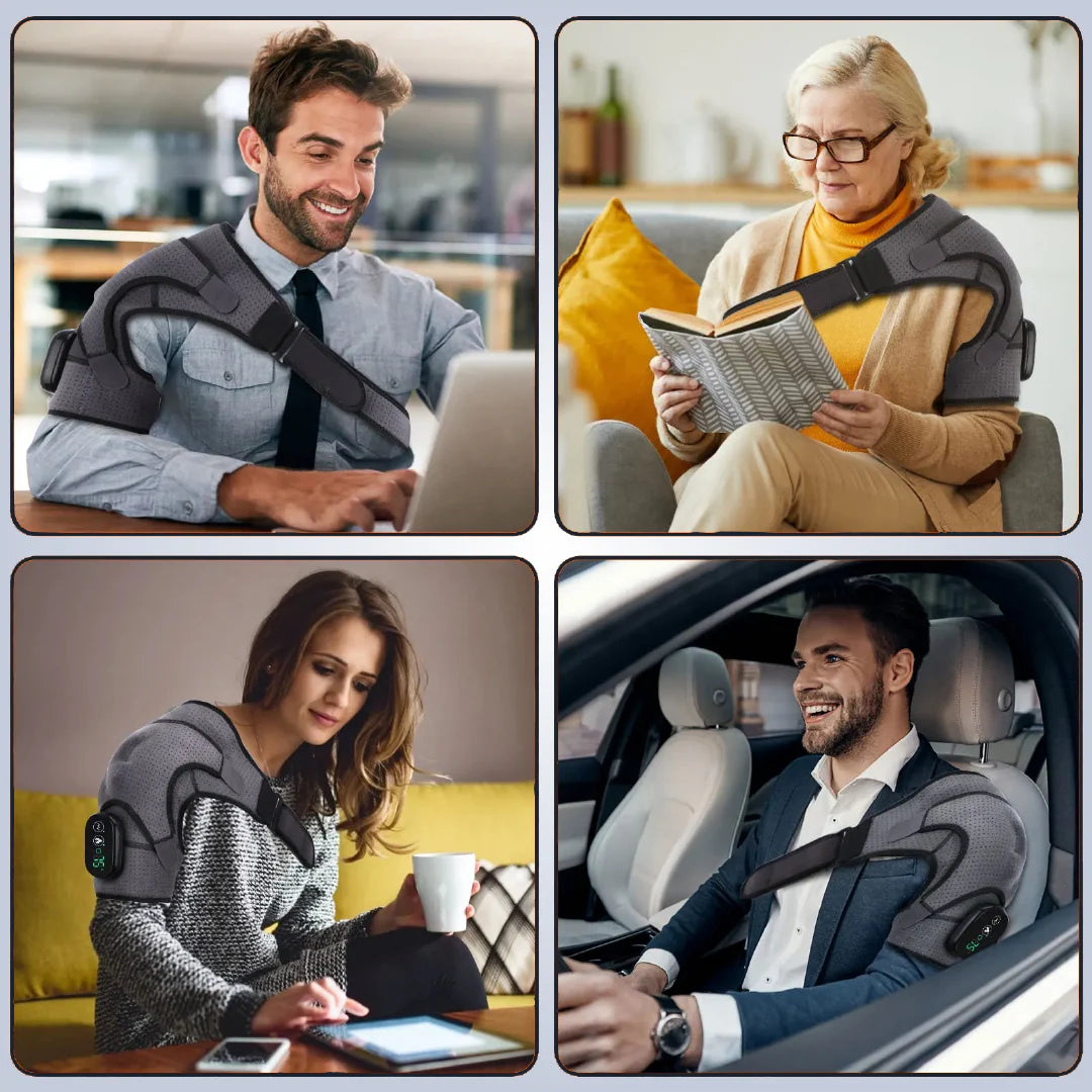 The 3-in-1 shoulder device combines heat therapy, vibration and adjustable compression support into one wearable solution—designed for convenient, daily relief at home.